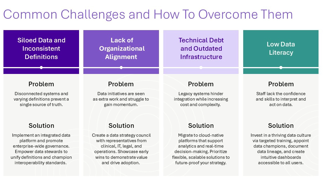 Solution: Create a data strategy council with representatives from clinical, IT, legal, and operations. Showcase early wins to demonstrate value and drive adoption.