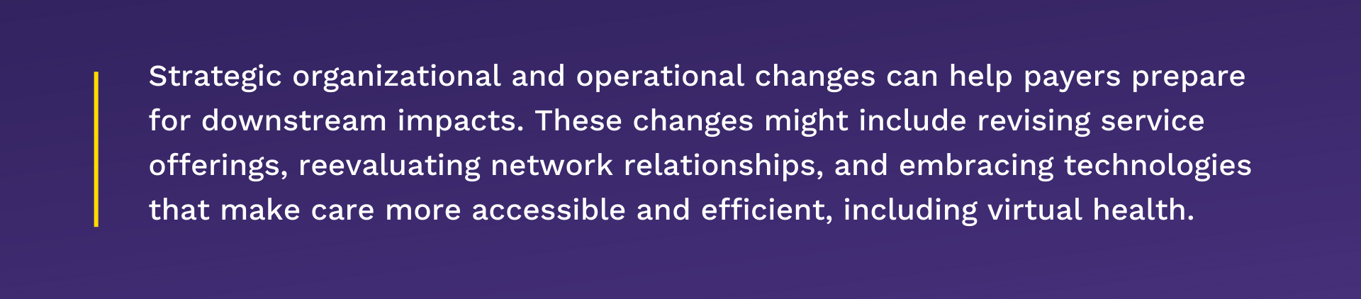 Strategic organizational and operational changes can help payers prepare for downstream impacts. These changes might include revising service offerings, reevaluating network relationships, and embracing technologies that make care more accessible and efficient, including virtual health.